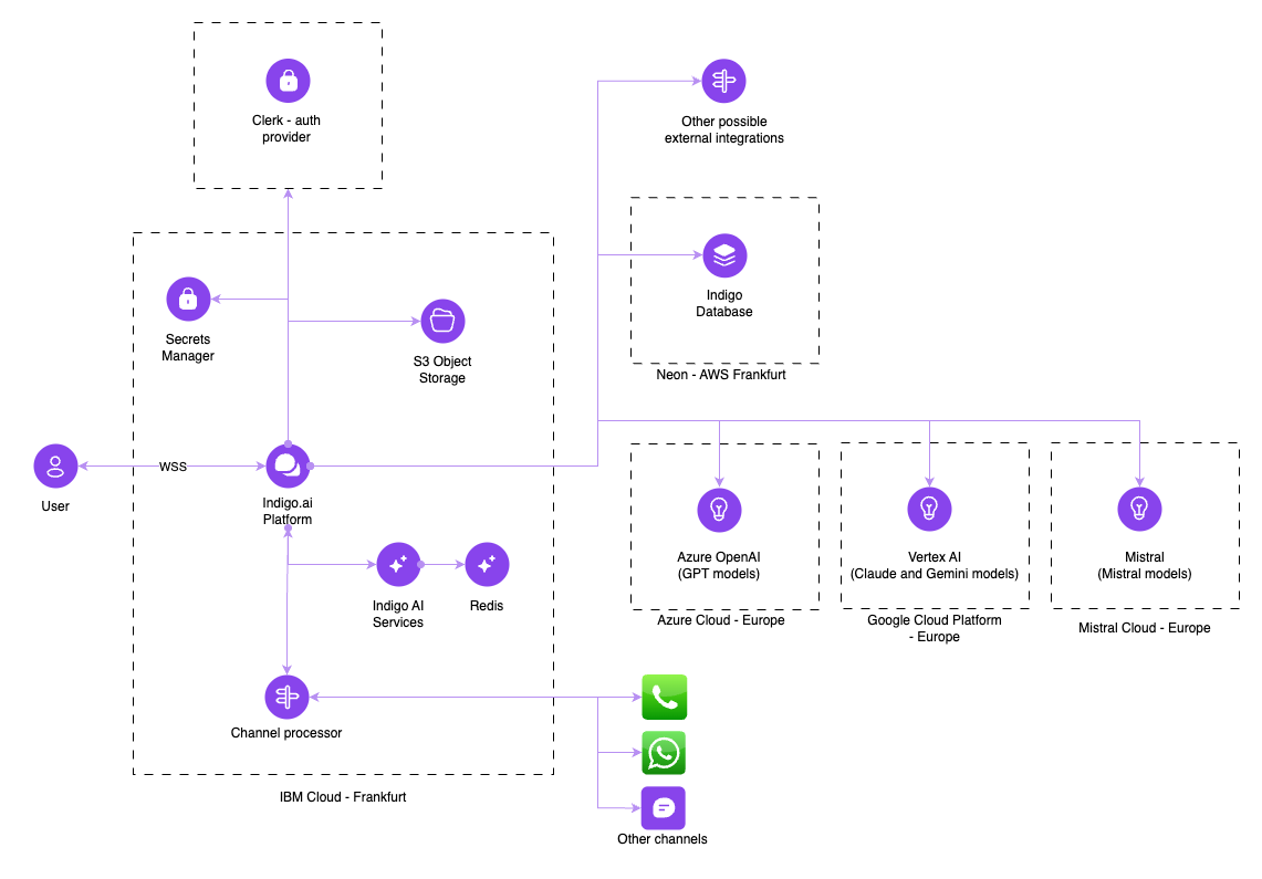 Yes. The SaaS platform operates on **indigo.ai–managed infrastructure**, primarily in IBM Cloud (Frankfurt) and AWS (Frankfurt) for select services (e.g., Neon DB). There’s no shared hosting with other SaaS providers.<br>